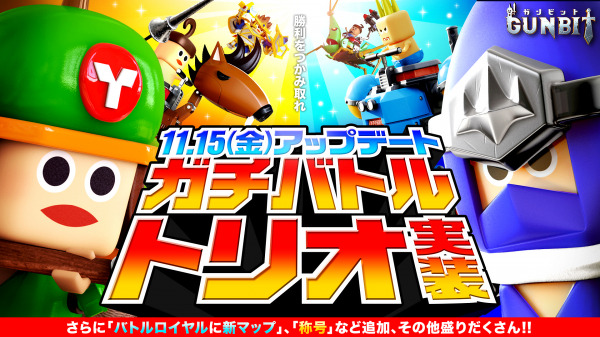 11月15日(金)に実施するアップデートにて、「ガチバトル」にトリオモードが実装されます。また、「バトルロイヤル」に新しいマップの追加や、条件を満たすと獲得できる「称号」の追加など、よりユーザーの皆さまにゲームを楽しんでいただけるよう仕様の追加をいたします。