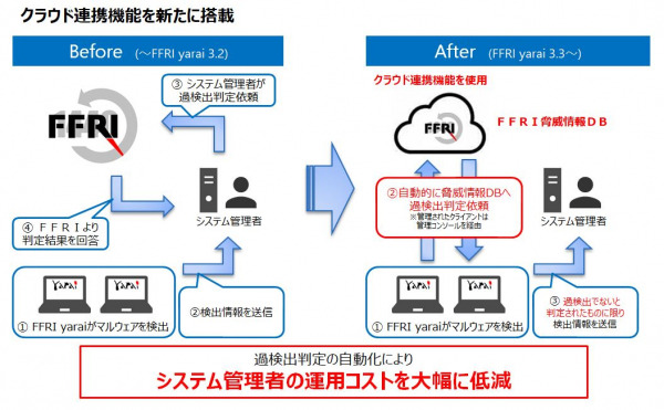 また、検出精度を向上し、システム管理者の負荷を低減する新機能「クラウド連携機能」を実装しました。本機能は、世界中から収集した脅威情報のデータベースを持つFFRI独自のクラウドと連携することで、FFRI yaraiの検出精度を向上させ過検出を低減することができます。これまで、過検出判定にかかる一連の作業は管理者が手動で行っておりましたが、過検出判定を自動でFFRIの脅威情報データベースに問い合わせることで、管理者の業務負荷並びに運用コストを大幅に低減する事が可能となります(上図)。なお、クラウド連携機能は今回のバージョンアップより標準搭載となり、追加費用なしでご利用いただけます。