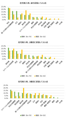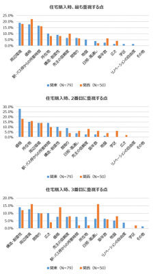 つづいて「3番目に重視する点」をたずねました。関東では『構造・耐震性』(13.9%)が最多で、『周辺環境』(12.7%)、『間取り』『広さ』(共に10.1%)とつづきましたが、関西では『周辺環境』『日照・風通し』(共に16.0%)が最多で、『価格』(14.0%)、『構造・耐震性』(12.0%)、『間取り』(10.0%)となりました。『日照・風通し』は関東では6.3%しかいなく、『広さ』(関東:10.1%、関西:4.0%)や『駅・バス停からの所要時間』『所在地』(共に関東:7.6%、関西:2.0%)も関東と関西で大きな違いが見られました。