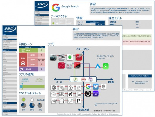 OEM別アプリ:各OEMが提供しているアプリについて、概要、アーキテクチャ、利用シーン、アプリの種類、課金モデル、ユーザーレビュー、画面スクリーンショット、同じアプリを提供しているOEMなど詳細情報を掲載。