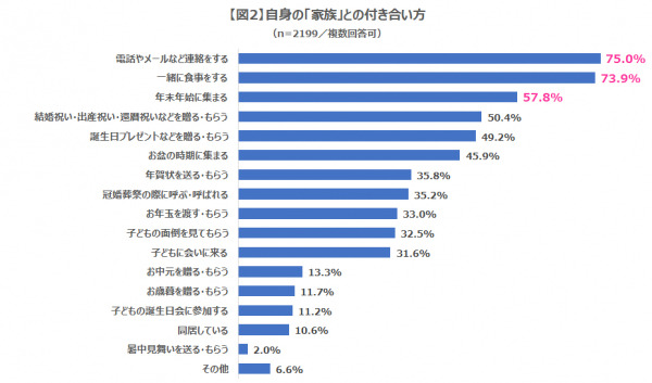 自身の「家族」とどのような付き合いがあるかをうかがってみたところ、第1位「電話やメールなど連絡をする」で75.0%、第2位「一緒に食事をする」が73.9%、第3位「年末年始に集まる」が57.8%となりました(図2)。日本では帰省と言えば、年末年始やお盆の時期に行なうことが多いですが、この結果から「年末年始に集まる」という人の割合のほうが「お盆の時期に集まる」という人よりも約10%高いことが分かります。年末年始は多くの企業や店舗が休日となりますが、お盆の時期は各社によって異なったり好きな時期に休みを取得できたりするケースがあることも影響していると考えられます。