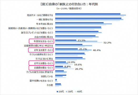 自身の「家族」との付き合い方を年代別に見てみると、「年賀状を送る・もらう」については20代が23.5%に対し40代が52.2%、「お年玉を渡す・もらう」については20代が25.1%に対し30代は40.4%に。「お中元を贈る・もらう」は20代が12.0%に対し40代が19.6%、「お歳暮を贈る・もらう」は20代が8.8%に対し40代は20.7%という結果になりました。日本ならではの慣習も年代によって実施率が大きく異なることが分かりました。