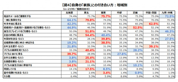 自身の「家族」との付き合い方について、回答者の住んでいるエリア別にみてみたところ、付き合いの有無についてはほぼ差異がなかったにも関わらず、付き合い方については地域差が出ました(図4)。下記に付き合い方の差異が10%以上出た項目と地域・割合を示します。