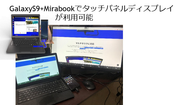 MirabookはDisplay-PortTMover USB Type-Cという技術を採用して、AndroidスマートフォンやノートPC、Raspberry Piまで有線でつなげることができ、充電・画像・音声・通信に信号をType-Cのケーブル1本でつなげスマートフォンをPC化
