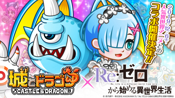 株式会社アソビズム(本社:東京都千代田区、代表取締役:大手智之)は、App Store・Google Playにて好評配信中の『城とドラゴン』で、株式会社KADOKAWA(本社:東京都千代田、代表取締役社長:松原眞樹)のTVアニメ『Re:ゼロから始める異世界生活』とのコラボイベントを、2019年12月6日(金)より開催することを決定いたしました。