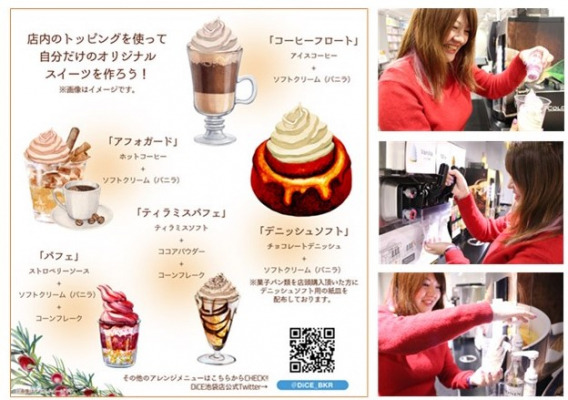 インターネットカフェ「DiCE(ダイス) 池袋店」において、12月16日(月)から12月26日(木)の期間でソフトクリームサーバーがあるカフェエリアに無料で使えるトッピングを複数設置※いたします。「DiCE」利用中は食べ放題であるソフトクリームと組み合わせることで、様々なオリジナルスイーツを無料で作る事ができます。