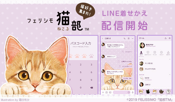 2010年9月から活動し、猫好きが集まる部活動「フェリシモ猫部」。「猫と人がともにしあわせに暮らせる社会」を目指し、販売している募金付きのオリジナル猫グッズは多くの方の声をとり入れて企画開発をしています。グッズ販売だけでなく、「今日のにゃんこ」「猫ブログ」や猫の写真を投稿できる「猫部トーク」などほかにも様々なコンテンツがございます。新作のLINE着せかえではイラストレーター霜田有沙さんのイラストを使用した大人かわいい着せかえ。友だちとのトーク中ひょっこり覗くかわいい子猫と目が合っちゃう…!そんな猫好きにはたまらないデザインとなっております。LINEを着せかえて子猫にじっと見つめられてみてはいかがでしょうか。