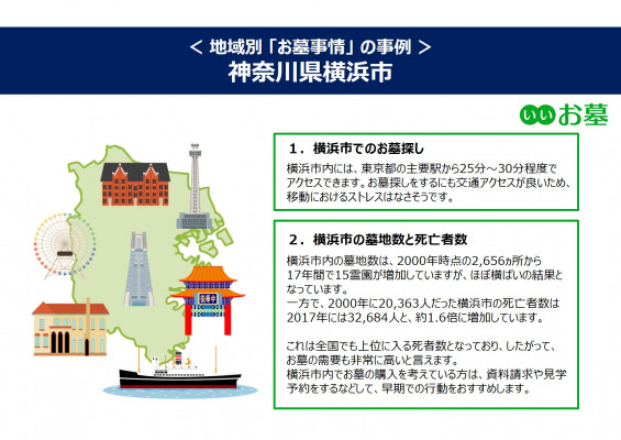 当社が運営する日本最大級のお墓の情報サイト「いいお墓」は、お電話やメールにて、年間14万件以上のご相談を承っています。さまざまなお悩み事をかかえるお客様がいらっしゃいますが、「お墓事情」は、地域によって大きく異なります。そこで創業以来35年間、終活領域で様々なサービスを提供してきた当社では、地域性に特化したお墓の情報をご提供することで、今まで以上にお客様のご要望に寄り添ったお墓探しをサポートしたいと考えました。