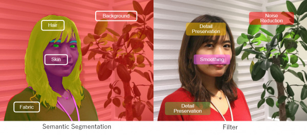 このたび発表した「Sematic Filter」技術では、AI(人工知能)を用いて画像の各ピクセルが何を意味するのかを判別するセマンティックセグメンテーション技術を使い、画像内の各ピクセルをカテゴリごとに分類し、それぞれのカテゴリに合わせてノイズ除去、ダイナミックレンジ補正、エッジ強調、ボケ加工などの画像処理を行います。それにより、物体ごとに残したいディテールや質感を失うことなく、よりクリアな画質の向上を実現します。
