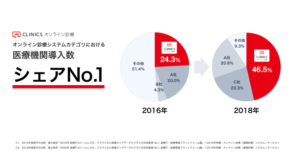 富士経済が隔年で実施している同調査によると、医療機関導入シェアにおいて、「CLINICSオンライン診療」は、2016年 24.3%(※2)、2018年 46.5%(※3)であり、2調査連続でシェアNo.1の結果となりました。また、2年間で22.2%のシェア伸長を実現しており、2019年においても「CLINICSオンライン診療」が同カテゴリで引き続きシェアNo.1の予測が示されています。