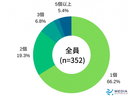 2020年のバレンタインデーに逆チョコを渡す予定のある方が用意しているチョコレートは、「1個」が66.2%(233人)と圧倒的に多く、続いて「2個」で19.3%(68人)となりました。