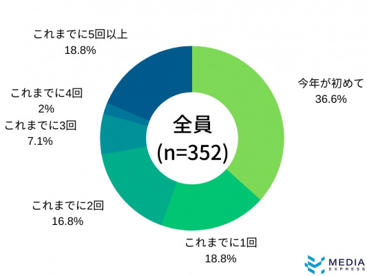 これまでに逆チョコをあげた回数は、「今年が初めて」が36.6%(129人)が最も多く、「これまでに1回」と「これまでに5回以上」が同数の18.8%(66人)となりました。