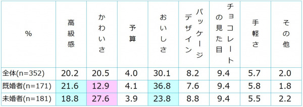 購入する逆チョコのチョコレートで優先するポイントは、既婚者では、「おいしさ」36.8%、「高級感」21.6%を重視しているという結果になりましたが、未婚者では、「かわいさ」27.6%、「おいしさ」23.8%という点を重視しているという結果となりました。