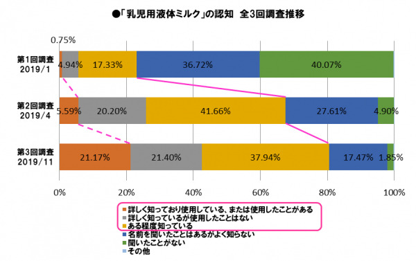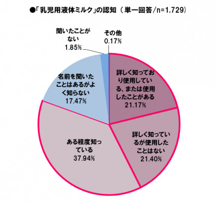 0歳児を持つ被験者における「乳児用液体ミルク」の認知度は、「(ある程度)知っている」が80.51%という結果になった。その内訳は、「詳しく知っており使用している、または使用したことがある」21.17%、「詳しく知っているが使用したことはない」21.40%、「ある程度知っている」37.94%である。