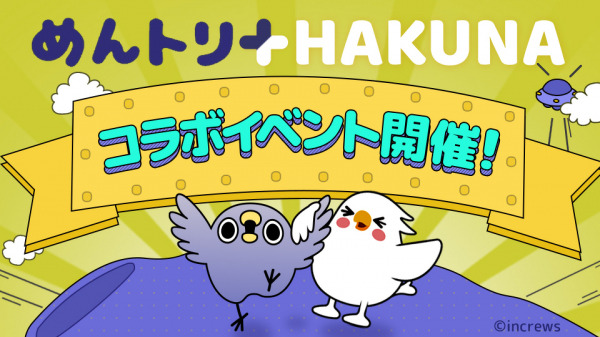 全世界のLINE Creators Marketだけで累計277万ダウンロード&送受信数36億回を突破した、 大人気LINEスタンプ「面倒だがトリあえず返信」から生まれたインクルーズのオリジナルIPの「めんトリ」。1,000種類を超えるグッズ化、大手アニメーション制作会社Production I.G制作でのアニメ化、黒い砂漠モバイルなどの10作品を超える有名ゲームとのコラボ、大手出版社宝島社での書籍化、世界中で僅か300種類しか選ばれていないFacebookメッセンジャーの公式スタンプでの採用、そして台湾での2ヶ月半に渡る大型展示会の開催、中国でのプライズ展開、さらにVtuberとしてもデビューした「めんトリ」が、今度はソーシャルライブ配信アプリ「HAKUNA」とコラボします。HAKUNAでは、「ライバー」となり、初回は2月4日(火) 20時より記念すべき第1弾となるライブ配信を行います。視聴者プレゼントもありますので、ぜひご参加ください。