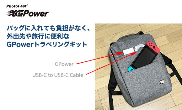 GPowerは、Nintendo Switch (TM) / iOS / Windows / Mac / Andriodにも対応する万能型です。GPowerがあれば、複数のアダプタや電源を持ち歩く必要ありません。GPowerには、USB-C to USB-Cケーブルが同梱(GPowerトラベリングキット)されています。バッグに入れておけば、必要な時にすぐにお使いになれます。