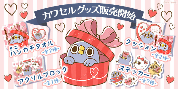 「カワセル」限定の「めんトリ」新商品は、書き下ろしの<バレンタイン>アート!昨年も大好評頂いた<バレンタイン>限定アートが2020年ver.になって登場です。クッション、ミニハンカチタオル、ステッカーの他、カワセルで初登場の白引きアクリルブロックが登場!印刷部分に白インクを置くため、くっきりとしたデザインを楽しむことの出来る豪華アクリルブロックとなっております。この機会に是非!
