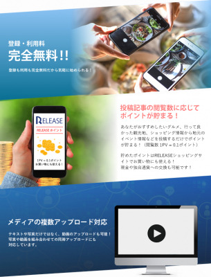 2014年にサービスを開始した、みんなで作るニュースサイト RELEASE(リリース)はおすすめグルメや地域のイベントやお祭り情報、観光地の案内、特産品の紹介など、写真や動画で投稿するユーザー参加型のニュースサイトです。