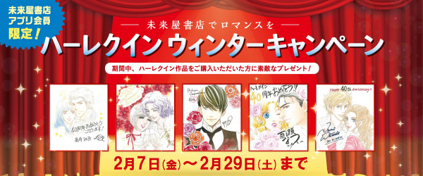 期間中、対象店舗でハーレクイン作品をご購入いただくとmibonポイント、さらに抽選でイラスト入りサイン色紙をプレゼントいたします。