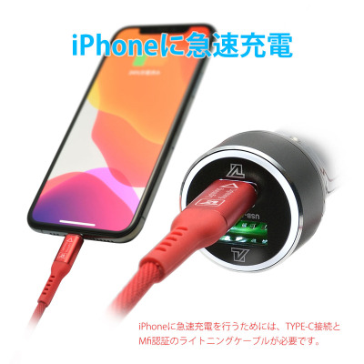 新世代端子の「Type-C」にはPD(Power Delivery)対応で最大27Wもの出力が可能。iPhoneの急速充電に対応でき、実に30分で最大50%まで充電できる。また、MacBookなどUSB Type-C充電に対応したノートPCへの充電にも対応している。(iPhoneへの急速充電には別途Type-C型のMfiケーブルが必要)
