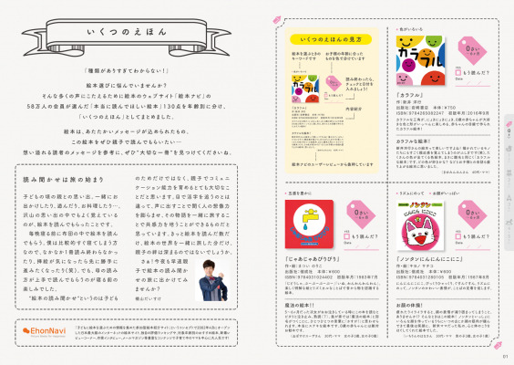 「いくつのえほん」絵本ガイドは、選ばれた全作品の内容紹介や「絵本ナビ」会員のママ・パパによるレビューなど、絵本選びの参考になる情報をたくさん掲載した小冊子で、全国の展開書店で配布しています。レビューによって「何歳の子どもに読んで、どんな反応があったか」ということなどがわかり、絵本をプレゼントする際の参考になります。2020年版では、巻頭にNHKの教育エンターテインメント番組「おかあさんといっしょ」の11代目歌のお兄さん・横山だいすけさんからのメッセージと、読み聞かせについてのコラムを掲載しています。