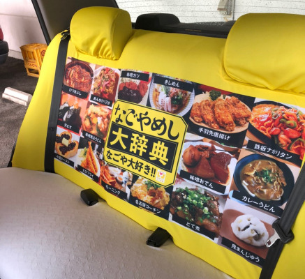 「なごやめしタクシー1号車」誕生記念として乗車した方に少しでもお楽しみ頂けるようにオリジナルのシーツカバーを後部座席に設置し、走行を開始致します。オリジナルシーツは、名古屋めしが大きくデザインされており、市外の方はもちろん、名古屋市民の方が名古屋飯を再認識し、より好きになってくれるきっかけとなればと願っております。
