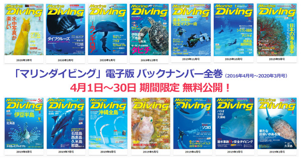 『マリンダイビング』では、海とダイビングを愛する皆さんに少しでも在宅時間を楽しく過ごしていただけるよう、『マリンダイビング』電子版のバックナンバーを全巻無料で公開することにしました。対象は「PressPad Store」に登録されている2016年4月号~2020年3月号の4年分で、2020年4月1日~30日の期間限定で実施します。
