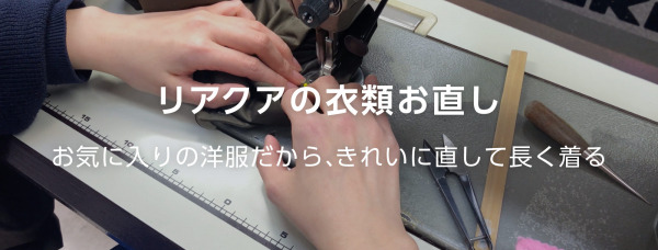 リアクアの衣類のお直し・修理サービスでは、「お気に入りの洋服だから、きれいに直して長く着る」をコンセプトに、インターネットから簡単に衣類のやぶれやほつれ直し、丈詰め、裾上げ等、あらゆる衣類のお直しを宅配便で集荷配達を行うことで、自宅にいながら気軽にご利用いただけます。