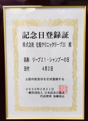 正真正銘自分の髪 リーブ21 (本社:大阪市中央区、代表取締役社長:岡村勝正、以下「リーブ21」)は、髪と頭皮の健康を考えて、正しいシャンプーをすることの大切さについて見直していただく機会として、4月2日を「リーブ21・シャンプーの日」と定め、登録認証を受けました。