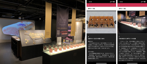 館内は、但馬牛のルーツや神戸ビーフの定義などをパネルや模型で紹介する情報発信コーナーと神戸ビーフを実際に食べることができる食体験コーナーに分かれています。情報発信コーナーでは、模型や映像を駆使して、但馬牛・神戸ビーフの歴史や美味しさの秘密といった他の和牛にはない魅力を発信しているほか、タブレットでは「神戸肉流通推進協議会」に指定登録され、神戸ビーフを味わえるレストラン等も紹介しています。また、食体験コーナーでは、シェフが目の前で焼くステーキをお手頃価格で味わうことができます。