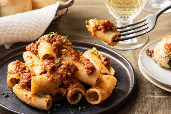 牛豚の合い挽きを使用し、旨みと食感の両方のバランスを考え作りました。粗挽きした肉をトマトと赤ワインで水分が少なくなるまで煮込むことで、お肉の旨みがギュッと凝縮されたボロネーゼに仕上がっています。無添加だから、お子様も安心してお召し上がりいただけます。