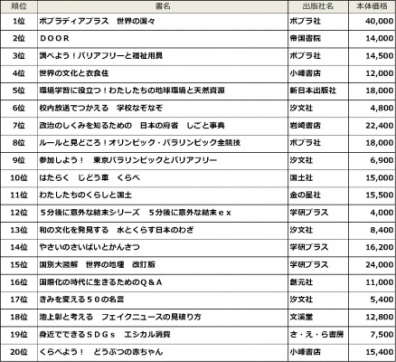 セット部門堂々の第1位は、『ポプラディアプラス 世界の国々』(ポプラ社)でした。2位の『DOOR』(帝国書院)ほか、4・8・9・15位にもオリンピック・パラリンピック関係の図書や、世界の国々について調べるのに役立つ図書がランクイン。特に、各地域の文化や特色などをより詳細に調べることができるセット図書の需要が高いことが伺えます。ほかには、去年に引き続き、『政治のしくみを知るための 日本の府省 しごと事典』(岩崎書店)、『くらべよう! どうぶつの赤ちゃん』(小峰書店)など、2020年度小学校教科書改訂後も引き続き掲載される単元に関連するセットが人気となりました。