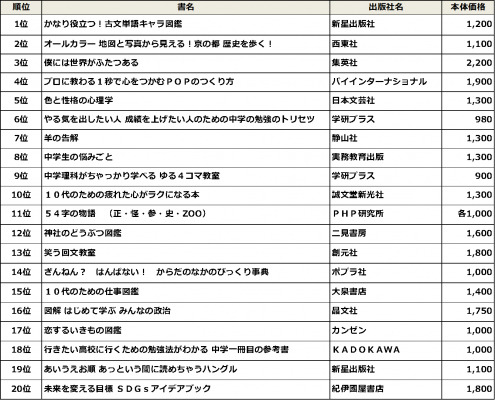 中学校の単品部門は、今回も高校受験や学力試験に向けた学習法の本が多数ランクインしています。特に「キャラクター」や「マンガ」で楽しく勉強でき、自然と知識が身につく図書が人気です。注目は11位の「54字の物語」シリーズです。限られた字数の中で物語が展開され、朝読の時間にぴったりだと人気を集めました。18位の『行きたい高校に行くための勉強法がわかる 中学一冊目の参考書』(KADOKAWA)は、なんと3年連続のランクイン! 効率的な勉強法が物語形式で紹介されており、学生だけでなく、大人も勉強になると評判です。