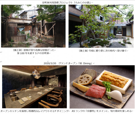 また2020年3月には新規事業となる飲食店「紡 Dining」を開業いたしました。これまでの「泊まる」という体験に「食べる」という付加価値をつけることにより、総合的なゲストの満足度の向上に繋げることはもちろん、より一層地域に根差した事業展開を行なって参ります。今期は更にさまざまなサービスや体験を提供する他の事業者との提携を予定しております。地元の企業と連携することで、京都にお住まいの方にも、京都を訪れる方にも活気ある魅力的な街作りをしていきたいと考えております。