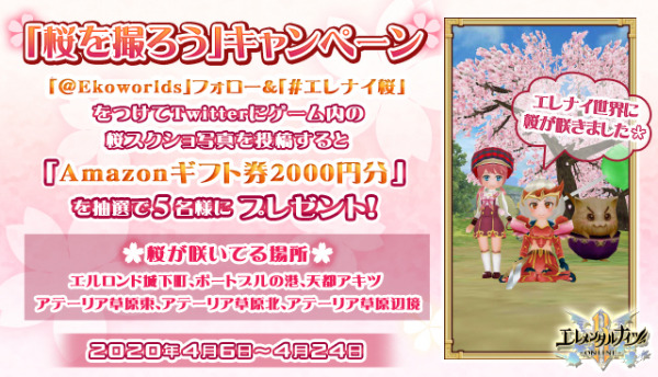 株式会社ウインライトは、本格MMORPG『エレメンタルナイツオンラインR』で、4月6日より「桜を撮ろうTwitterスクショ投稿キャンペーン」を開催いたしました。期間中、「@Ekoworlds」フォロー&「#エレナイ桜」をつけて、Twitterにゲーム内の桜スクショ写真を投稿すると、Amazonギフト券2000円分を抽選で5名様にプレゼントします。