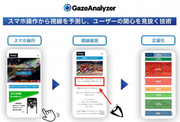 そこでヒトクセでは、スマホ上でのタップ動作やスクロールの動きのパターンから顧客の視線を予測するAIアルゴリズムを開発し、サイト内のどの要素を「見た」のかを把握することで顧客の関心位置を可視化する「GazeAnalyzer」を開発しました。