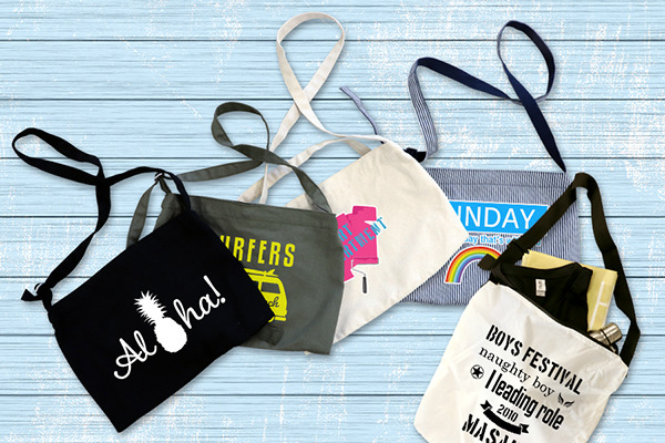 「キャンバスミュゼットバッグ」は、大人気のキャンバス生地を使用。12ozの厚めのキャンバス地なので、重いものを入れても安心です。ナチュラルな生地感なので、フルカラーでデザインをすると優しく馴染むのが魅力です。「リップスクエアショルダーバッグ」は、裂けにくく撥水効果もある素材を使用しています。スポーツシーン・おでかけどちらにも使えて便利なファスナー付き。中身も見えにくくなっているのでちょっとした着替えなどを入れることも可能です。ロゴをデザインして、スポーツクラブやヨガ教室の会員バッグとしてもおすすめです。