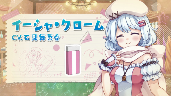 第一弾は「消しゴム:イーシャ・クローム」(CV:石見舞菜香)のキャラクターPVを公開しており、配信開始までに「鉛筆:ペルル・スペルライト」(CV:木野日菜)と「定規:リアネル・ラルセス」(CV:千菅春香)のキャラクターPVを順次公開いたします。