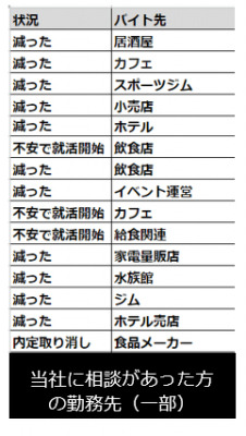「雇い止めの人数はすでに1000人以上」という報道もある中、コロナウイルスの影響は非正規雇用者たちにも及んでいます。当社にも「コロナが理由でバイトを減らされた」といった相談がすでに30件以上寄せられており、ある20代男性は「大型施設の飲食店にて勤務しているが、イベントの中止が相次ぎ、4月は完全に休業すると通達を受けた。1人暮らしのため、金銭的な余裕がないので、正社員として早く就職したい」と話しました。