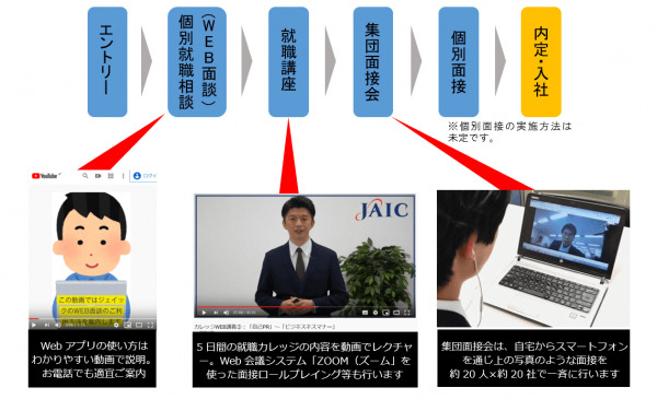 こうしたニーズに応えるため、当社は今回、2005年の「就職カレッジ(R)」開講以来初めて、面談~就職講座~集団面接会の全工程をオンラインで開催することを決定しました。オンラインで就職支援を行うことで、就活生、採用担当者の身の安全に配慮しつつ、早期の正社員就職斡旋を目指します。