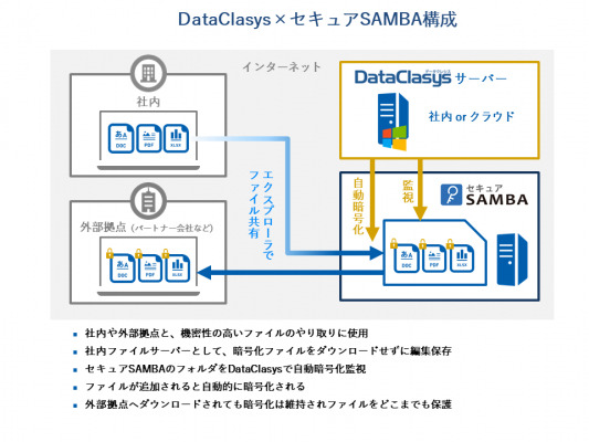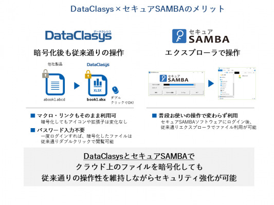 DataClasys社は今回の業務提携により、自社開発の暗号化・DRM製品「DataClasys(以下データクレシス)」と「セキュアSAMBA」を連携させ、テレワーク(モバイルワークや在宅勤務)におけるファイル共有の情報漏洩対策として、販売する事が可能となります。提供開始時の連携では「データクレシス」はオンプレミス提供となりますが、将来的に「セキュアSAMBA」と連携した「データクレシス」をクラウド環境にて提供が可能です。また、スターティアレイズとしては、通信時の暗号化だけではなく、「セキュアSAMBA」に保管されているファイルそのものも暗号化されることとなり、ファイルの常時暗号化やヒューマンエラーによる情報漏洩を気にする企業に向けての提案が可能となります。(※サービスの利用には別途お申込が必要。)
