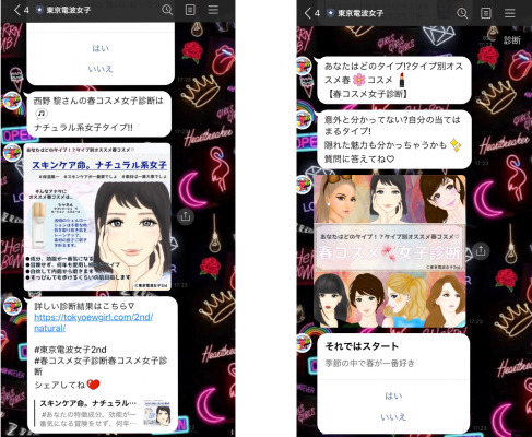 春コスメ女子診断は東京電波女子2nd公式LINEで遊ぶことができます。