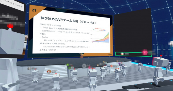 ・登壇者、参加者ともアバターで可視化し動いているため「集まっている感覚」が得られる。(VRヘッドセットを所持している人はVRヘッドセットで没入しての参加も可能)