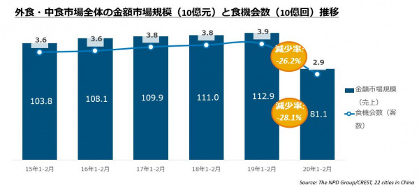 中国外食・中食市場の2020年1-2月の売上高は、28%減