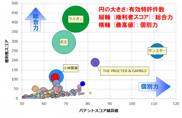 総合力1位のライオンは、「刺激が緩和され、使用感と共に歯垢の付着抑制に優れた口腔用組成物」に関する技術や、「口腔内での滞留性、使用時の泡立ち、保存安定性をそれぞれ向上させた歯磨剤組成物」に関する技術などが、注目度の高い特許として挙げられます。