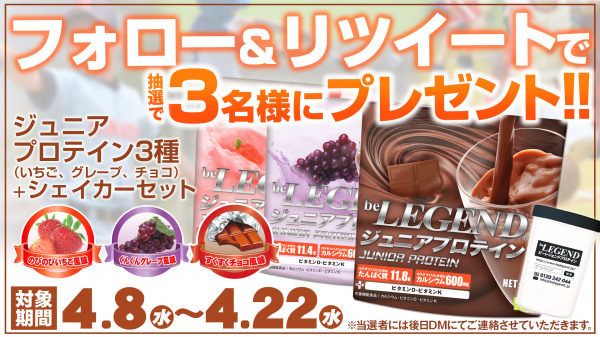 本キャンペーンでは、「ビーレジェンド ジュニアプロテイン すくすくチョコ風味」、「ビーレジェンド ジュニアプロテイン のびのびいちご風味」、「ビーレジェンド ジュニアプロテイン ぐんぐんグレープ風味」と「ビーレジェンド シェイカー」のセットを6名様(Instagram・Twitterそれぞれ3名様ずつ)にプレゼントいたします。