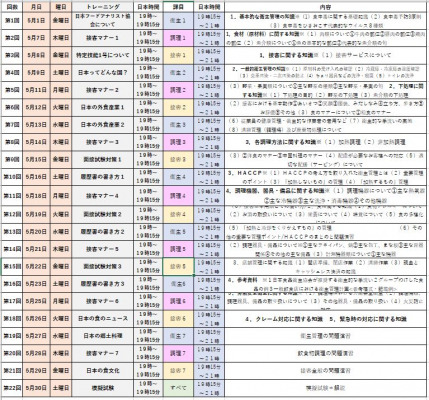 外国人向けの特定1号外食業技能測定試験受験対策スクールは22日間(1日2時間)のカリキュラムで、12か国(ベトナム、中国、フィリピン、インドネシア、タイ、ミャンマー、カンボジア、ネパール、モンゴル、ラオス、バングラディッシュ、スリランカ)対応です。