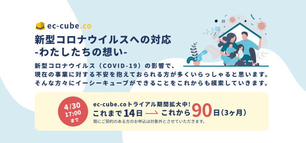 この度は、新型コロナウィルスの影響で、多くの中小企業様が事業継続に課題を持たれる中、安心してオンラインビジネスをスタートしていただく手助けが少しでもできればという想いから、「ec-cube.co」の無料トライアル期間延長を実施する運びとなりました。