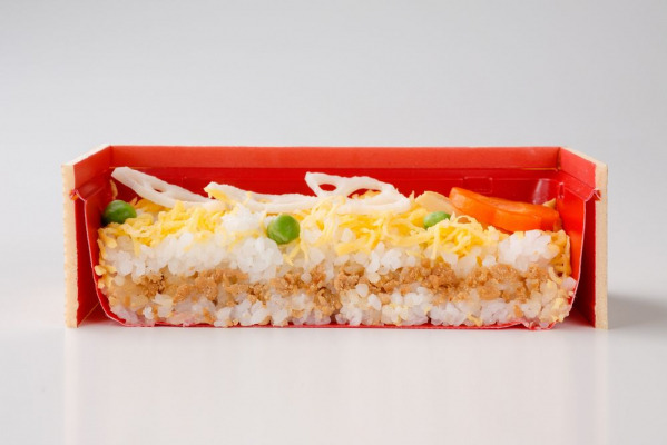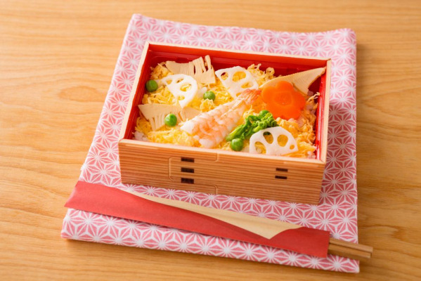 季節ごとに旬の食材を入れたちらし寿司はわんまいるの人気商品で、今回は、京都洛西産のたけのこをはじめ、菜の花、海老、蓮根、花にんじん、錦糸玉子を華やかにちりばめてあります。酢飯の間には甘辛く味付けした鶏そぼろを敷き詰めたちらし寿司です。酢飯の酸味と鶏そぼろの甘味が絶妙にマッチしています。お祝いの時や急なお客様の対応などにも便利です。