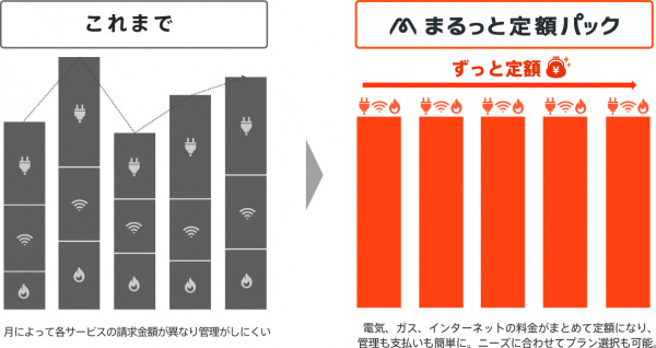 電気、ガス、そして現代の生活に不可欠なインターネット回線を1つの窓口に“まるっと”まとめ、毎月の支払額を定額化することで、利用者の家計管理を簡便化するサブスクリプションモデルで、電気・インターネットのみならず、ガスについても基本的には定額となることを前提としたサービスという点では業界初(※5)となります。